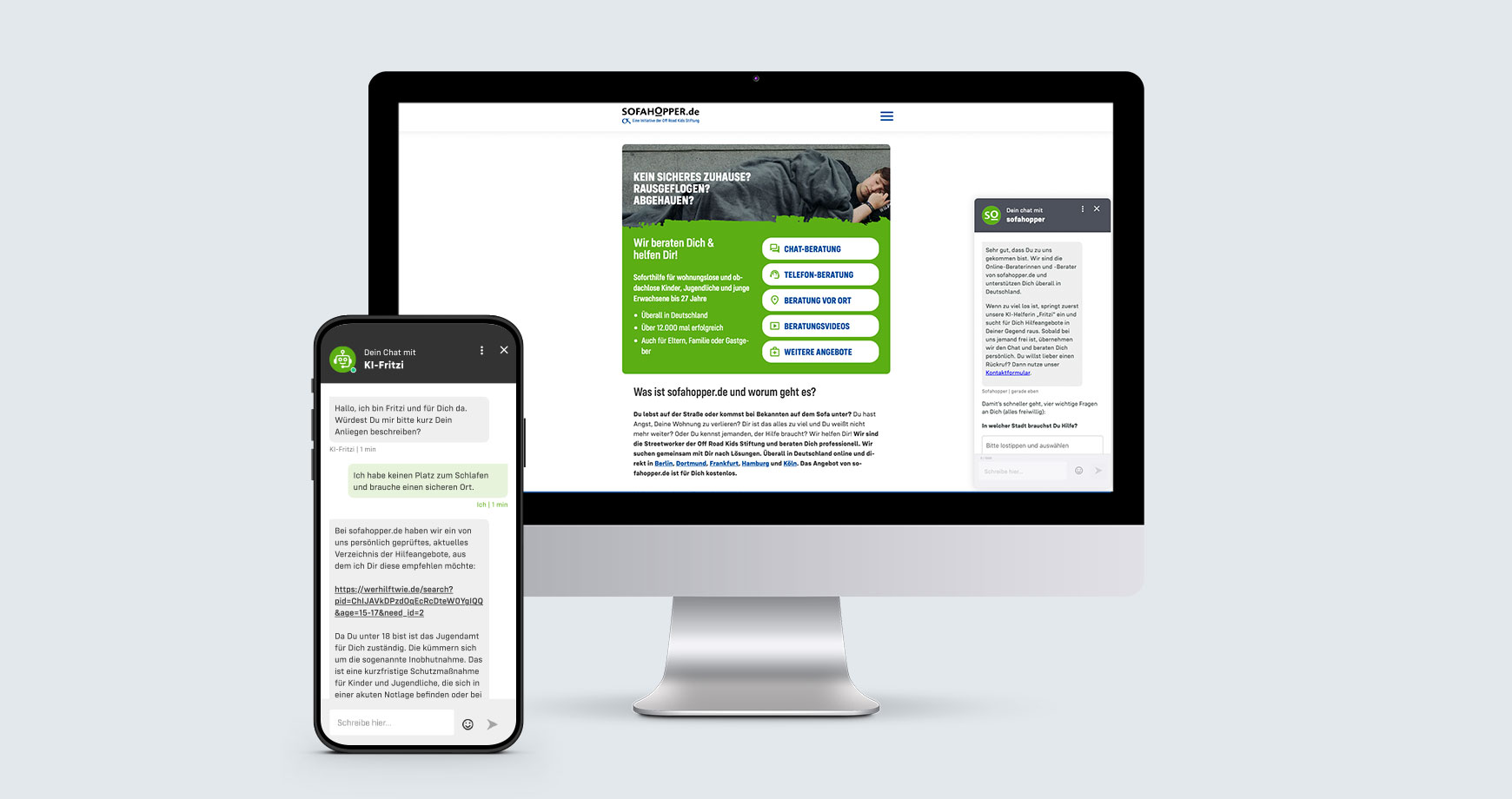 Auch hier verantworten wir den kompletten Leistungsumfang. Aktuell arbeiten wir an an der Erweiterung der digitalen Streetwork. Bestehend aus dem KI-Chatbot „Fritzi“, der Hilfesuchende schnell und zuverlässig zu den für Sie passenden Hilfeangeboten führt und der dazu gehörigen ersten deutschlandweiten Online-Hilfeangebote Datenbank werhilftwie.de.